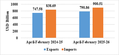 - India’s total exports during April-February 2025-26* is estimated at US$ 790.86 Billion registering a positive growth of 5.79 percent. Total imports during April-February 2025-26* is estimated at US$ 900.51 Billion registering a growth of 7.37 percent.