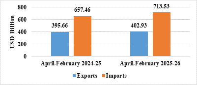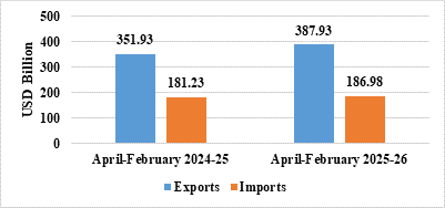 - Merchandise exports during April-February 2025-26 were US$ 402.93 Billion as compared to US$ 395.66 Billion during April-February 2024-25.