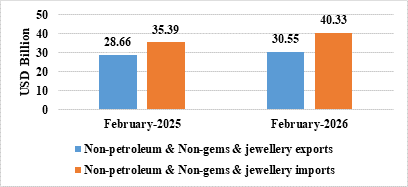 - Non-petroleum and non-gems & jewellery exports in February 2026 were US$ 30.55 Billion compared to US$ 28.66 Billion in February 2025.