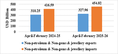 - Non-petroleum and non-gems & jewellery exports in April-February 2025-26 were US$ 327.96 Billion, compared to US$ 310.25 Billion in April-February 2024-25.